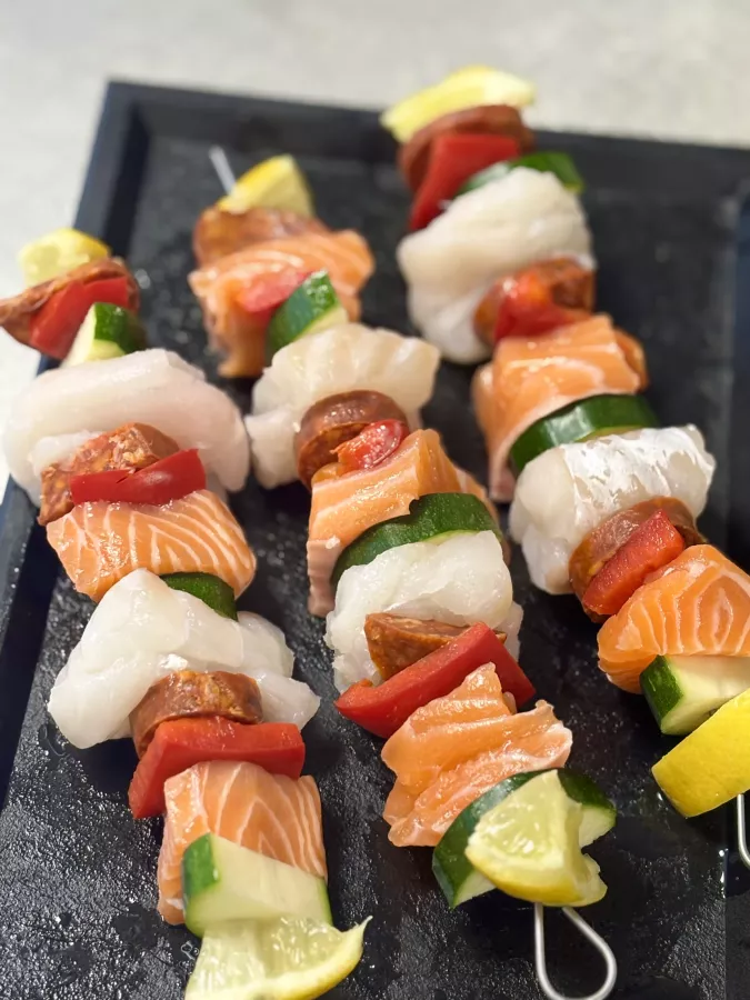 Brochettes faites avec du cabillaud, saumon écossais Label Rouge, chorizo courgette, poivron rouge et citron.