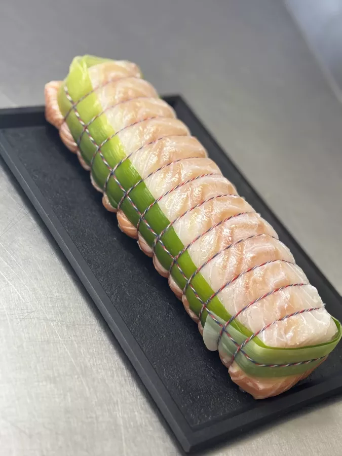 Rôti de cabillaud et saumon écossais Label Rouge entouré d'un blanc de poireaux.