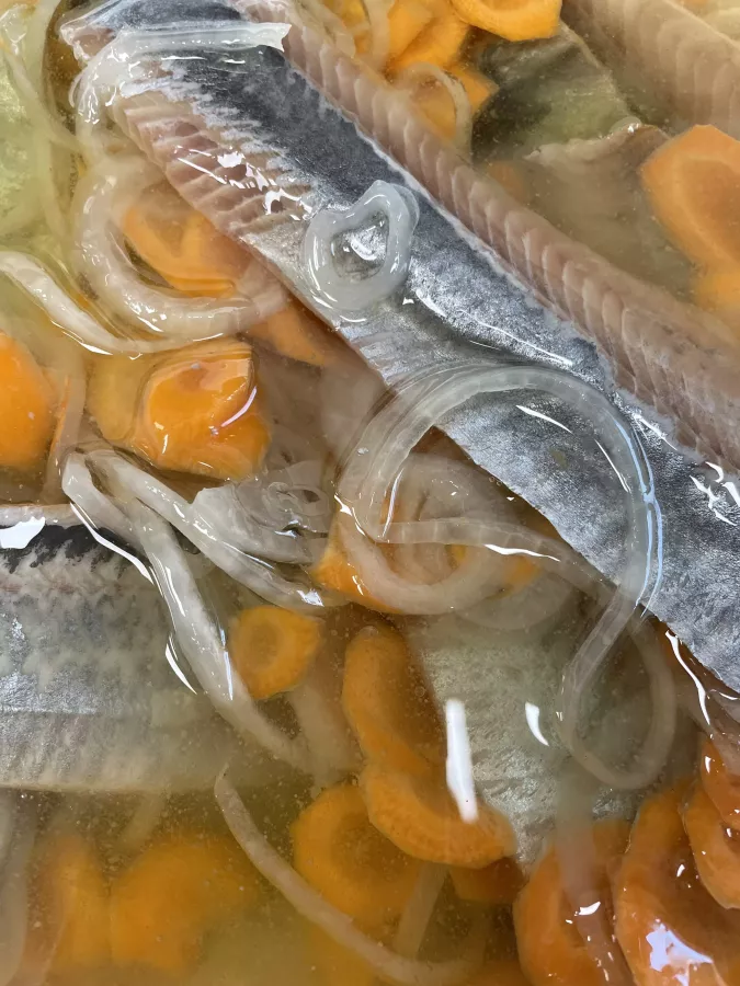 Nous vous le proposons fumé et mariné dans l'huile de tournesol avec des rondelles de carottes et oignons.