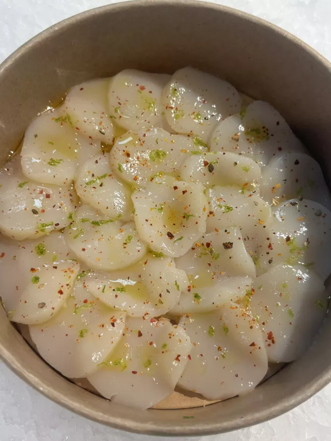 Carpaccio noix saint Jacques huile d'olive fleur de sel piment d'espelette et zeste citron vert
